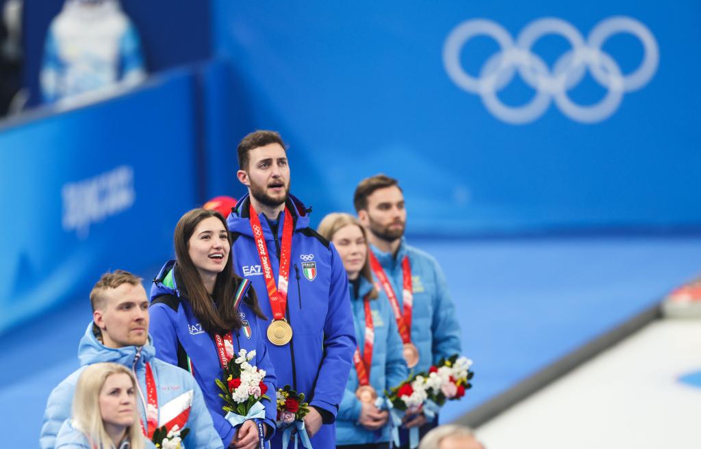 2月8日,在北京国家游泳中心“冰立方”举行的北京2022年冬奥会冰壶混双金牌赛中,意大利队战胜挪威队获得金牌。冠军意大利队选手斯特凡尼娅·康斯坦丁尼(左三)与阿莫斯·莫萨纳(右三)在颁奖仪式上。新华社记者刘续摄