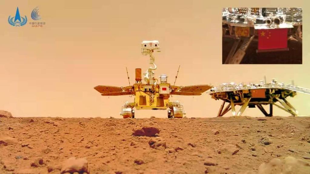 在“天问一号”传回的视频中可以看到,金色的环绕器反射太阳光的位置在逐渐变化,从右下角逐渐向中间移动,直至强烈的阳光照射在五星红旗上,五星红旗始终清晰可见。