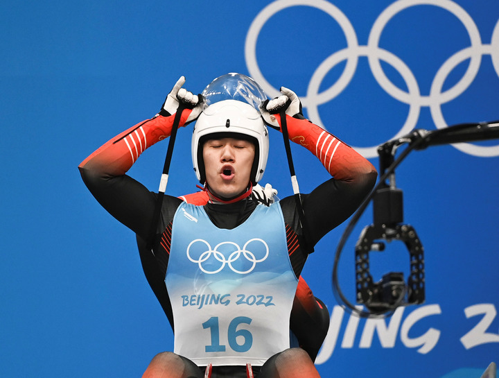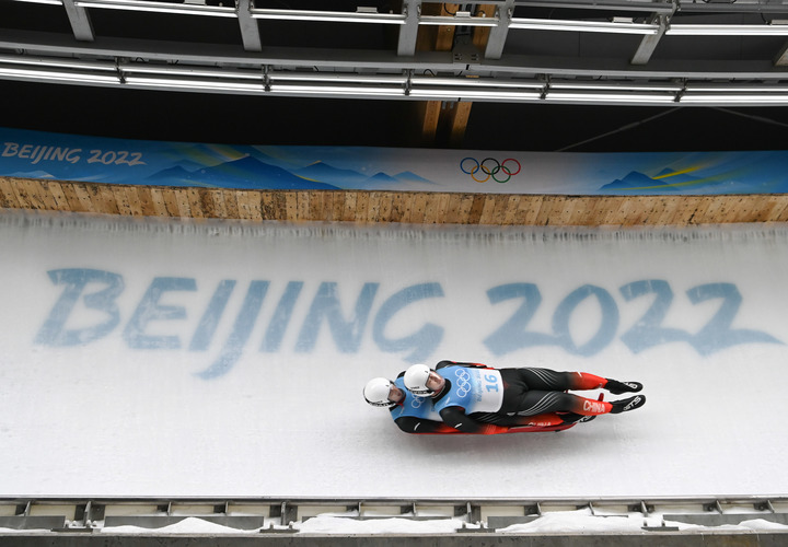2月9日,中国选手黄叶波和彭俊越在北京2022年冬奥会双人雪橇项目比赛中。新华社记者孙非摄