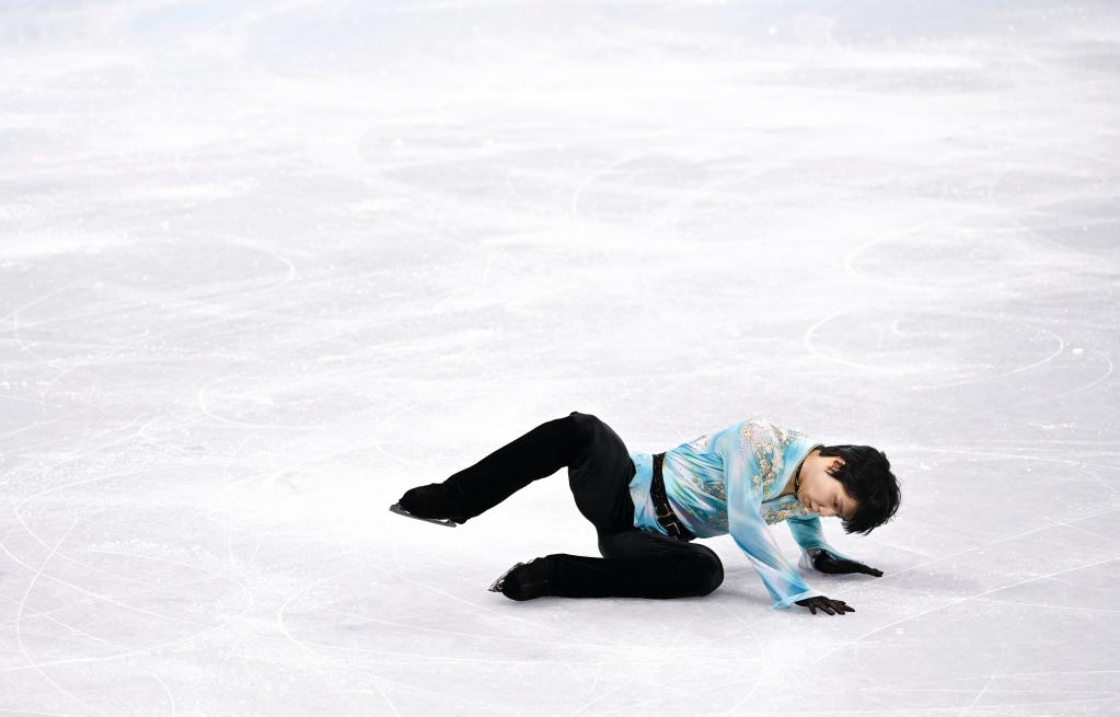 2月10日,日本选手羽生结弦在比赛中摔倒。当日,北京2022年冬奥会花样滑冰男子单人滑自由滑比赛在首都体育馆举行。新华社记者李一博摄