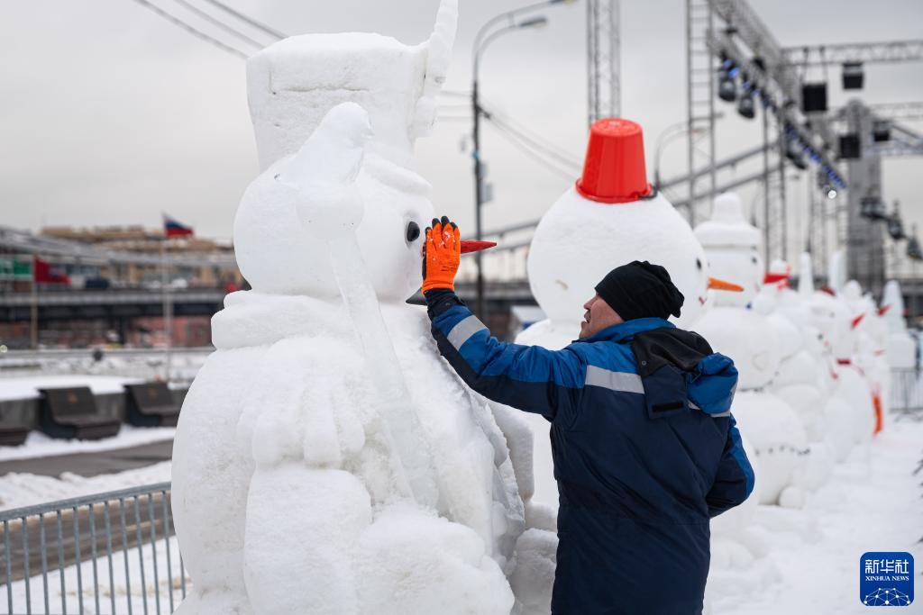 2月10日,在俄罗斯莫斯科高尔基公园,工作人员修补展出的雪人。