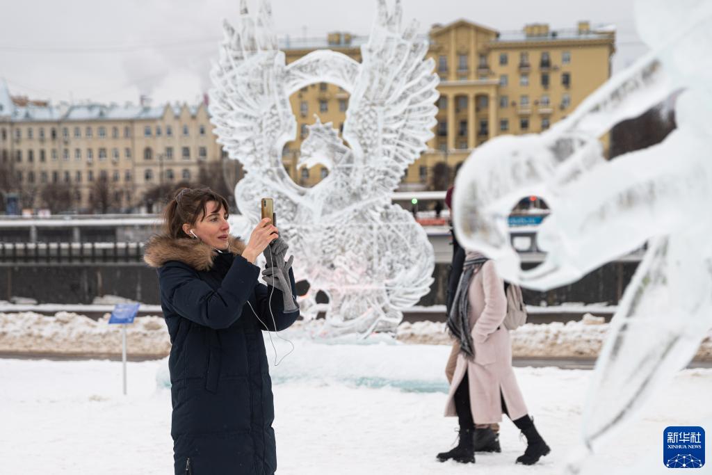 2月10日,在俄罗斯莫斯科高尔基公园,游客在冰雕前拍照。