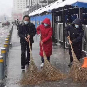 南京火车站工作人员在进站口扫雪除冰。(铁路南京站供图)