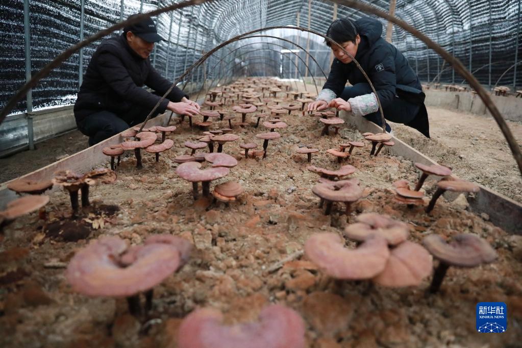 2月11日,在浙江省杭州市临安区天目山镇中草药种植园内,工作人员对种植的灵芝进行管护。