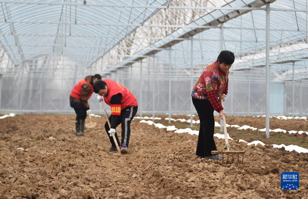 2月11日,在安徽省合肥市庐阳区大杨镇十张村一农业大棚,党员志愿者帮助农民进行西瓜地开沟起垄。