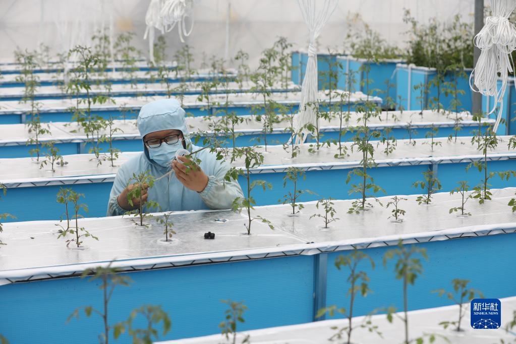 2月11日,在安徽省合肥市蜀山区南岗镇一处无土栽培大棚里,技术人员在观察蔬菜的长势。