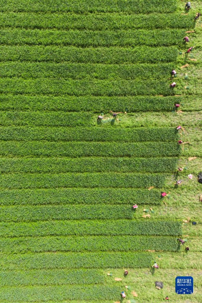 2月11日,四川省内江市东兴区田家镇火花村村民在采收蒜苗(无人机照片)。