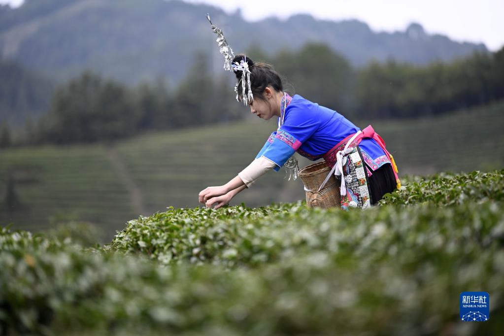 2月10日,在广西柳州市三江侗族自治县古宜镇光辉村马湾茶场,一名侗族姑娘采摘早春茶。