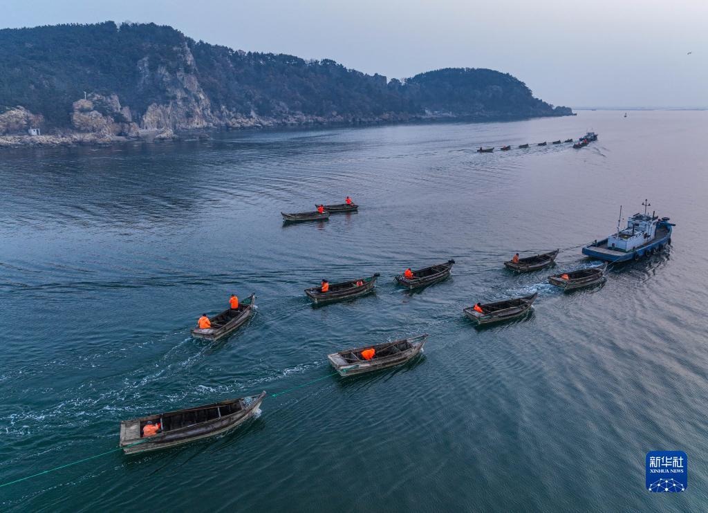 2月11日,在山东省荣成市俚岛湾畔,渔民们驾驶着各类渔船舢舨前往养殖海区作业(无人机照片)。