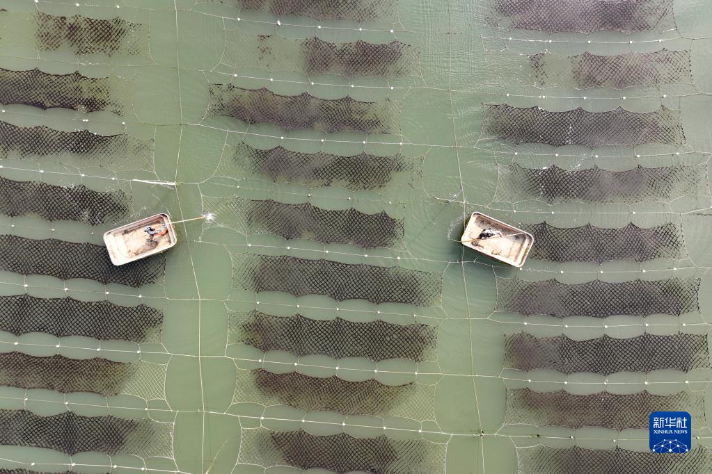 2月10日,江苏省连云港市赣榆区沿海紫菜养殖户在管理紫菜(无人机拍摄)。