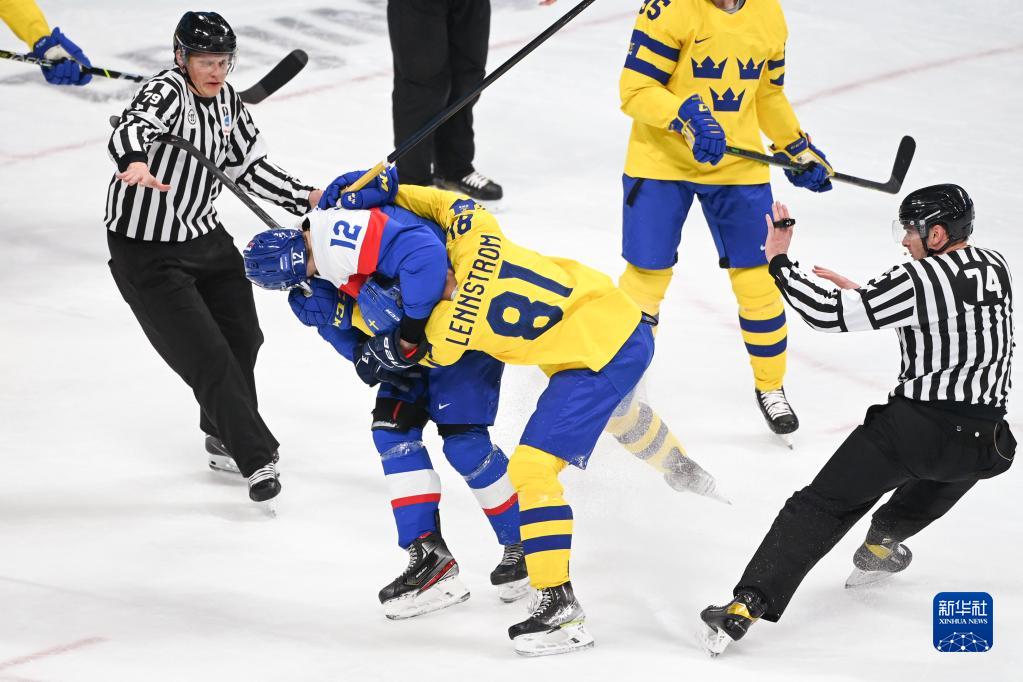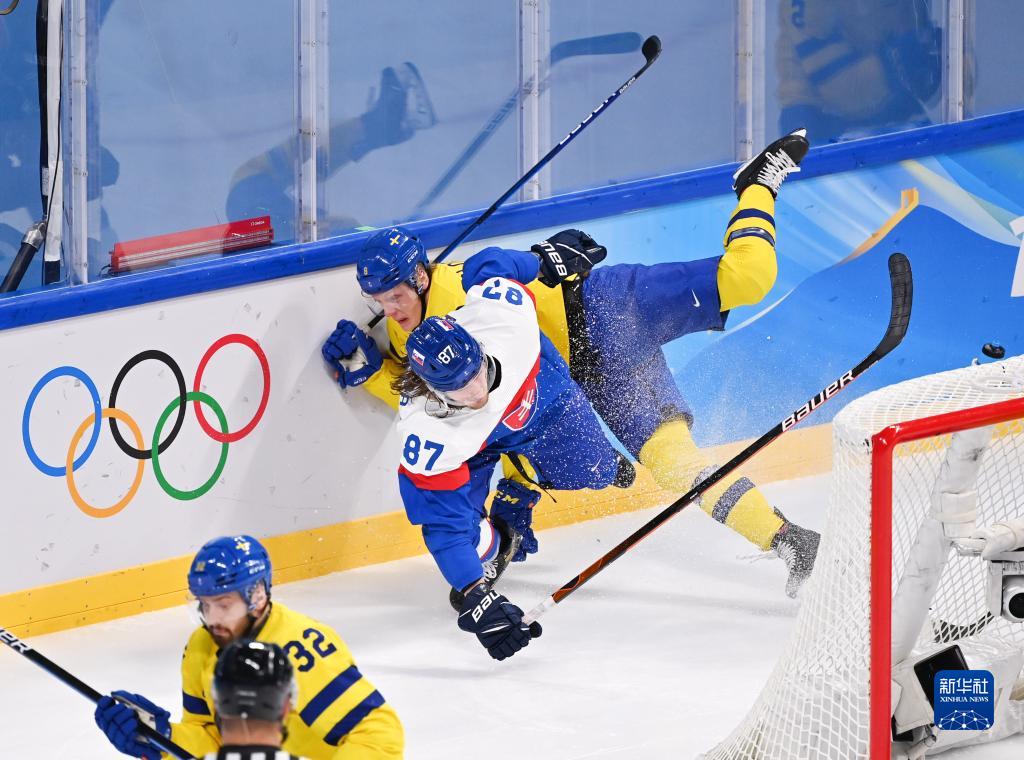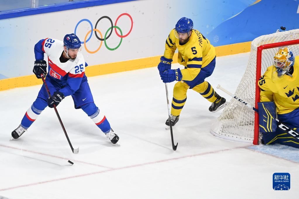 当日,在北京五棵松体育中心举行的北京2022年冬奥会男子冰球小组赛中,瑞典队以4比1战胜斯洛伐克队。