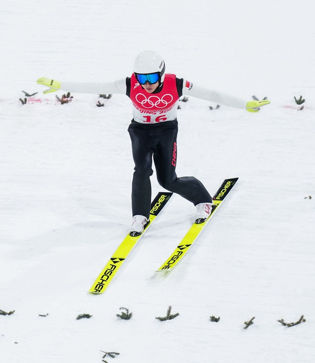 2月11日,中国选手宋祺武亮相男子个人大跳台赛场,在试跳轮中准备出发。新华社记者朱峥摄