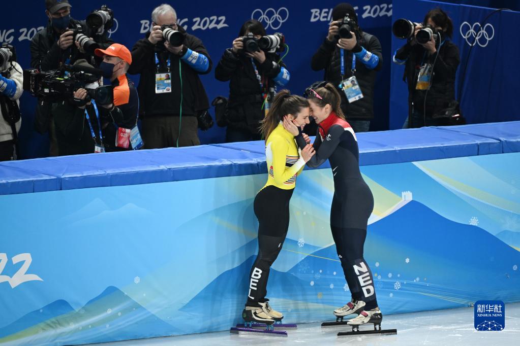 2月11日,荷兰选手苏珊娜·舒尔廷(前右)在比赛后与比利时选手汉娜·德梅(前左)庆祝。