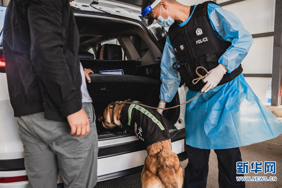 图为警犬检查车辆。新华网发(云南普洱边境管理支队供图)
