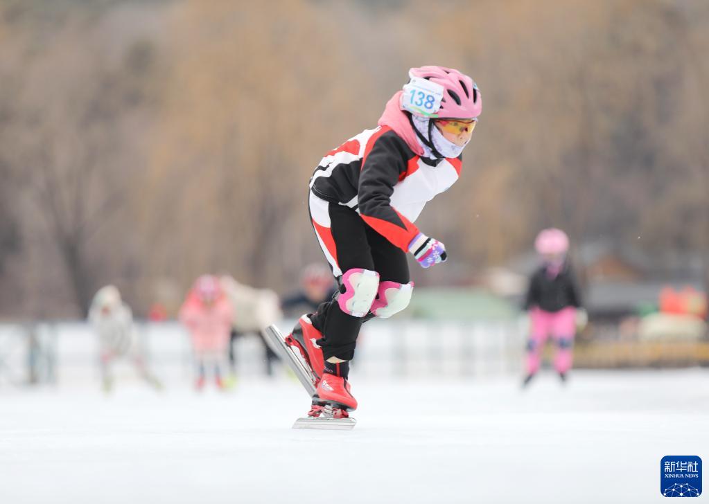2月12日,在河北承德避暑山庄冰上运动基地,学生在练习速滑。