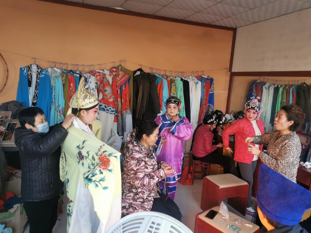 戴上胡子、穿上状元袍、蹬上靴子、围上披风……山东省济南市章丘区文祖街道青野村戏台旁边的化装间里,村民们正在化装。过一会儿,她们将会变成老生、花旦,为十里八村的村民们奉献一场五音戏表演。