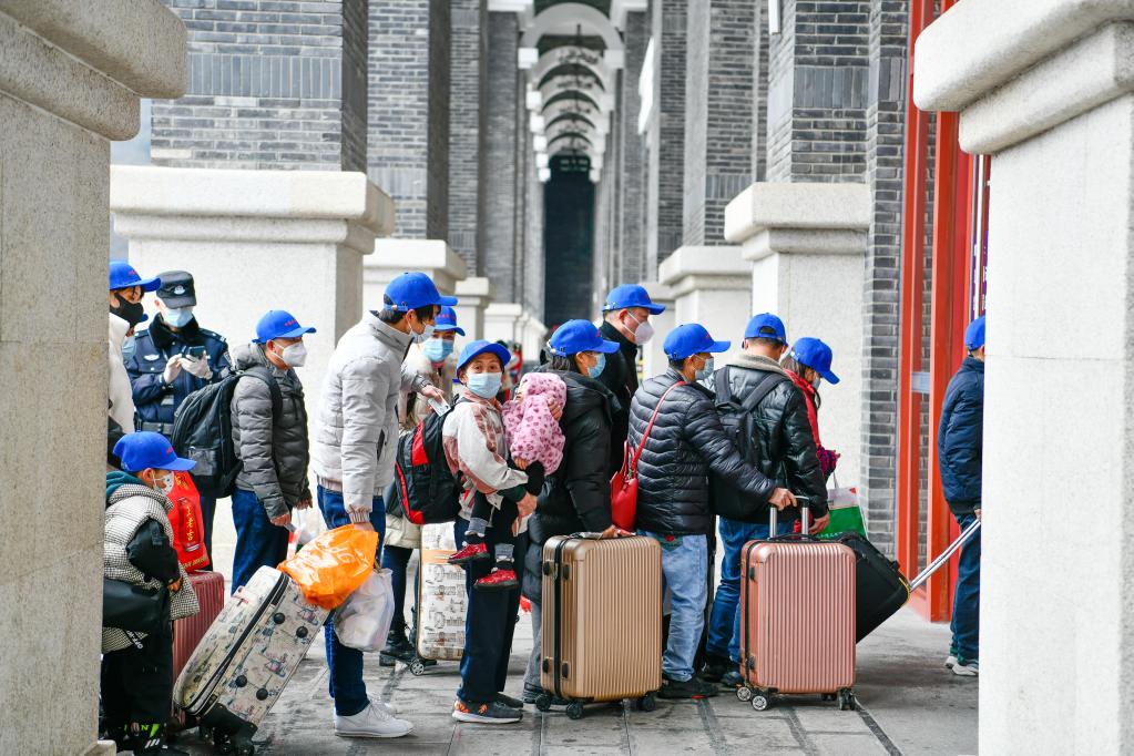 2022年2月8日,贵州今年首趟返岗务工免费动车专列发车,返岗务工人员在遵义站排队等待安检,前往广东省广州市、珠海市返岗务工。新华社记者 杨文斌 摄