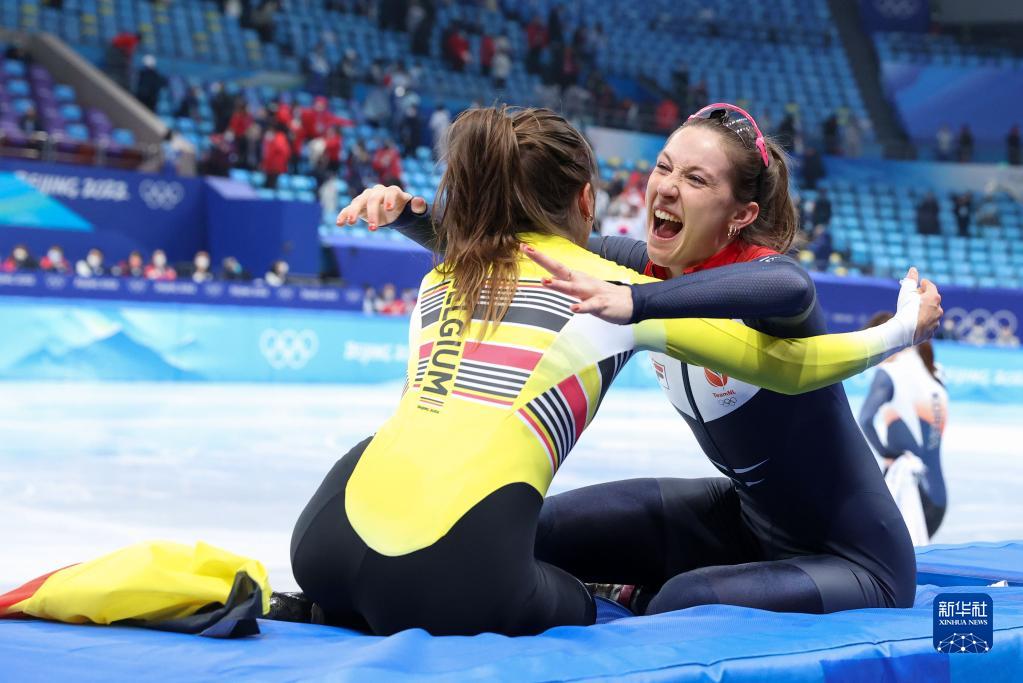 2月11日,荷兰选手苏珊娜·舒尔廷(右)在比赛后与比利时选手汉娜·德梅庆祝。