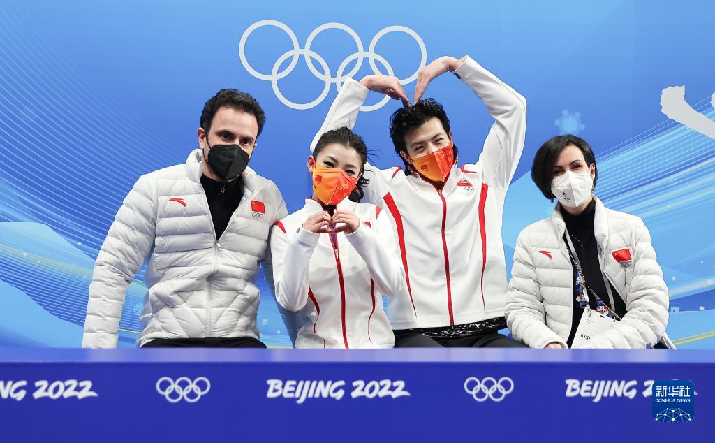 2月12日,中国选手王诗玥(左二)/柳鑫宇(右二)在比赛后等待成绩。