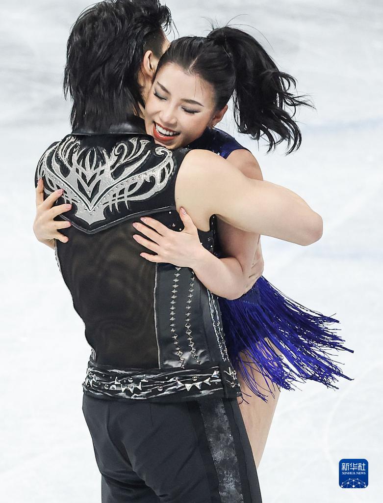 2月12日,中国选手王诗玥/柳鑫宇(右)在比赛后拥抱庆祝。