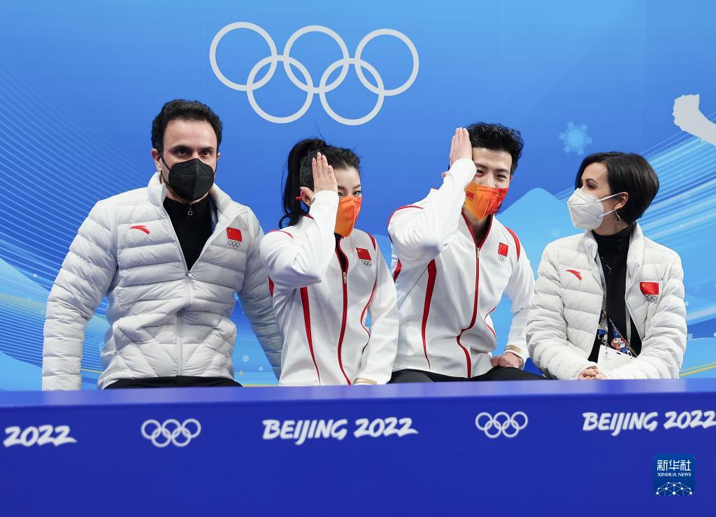 2月12日,中国选手王诗玥(左二)/柳鑫宇(右二)在比赛后等待成绩。