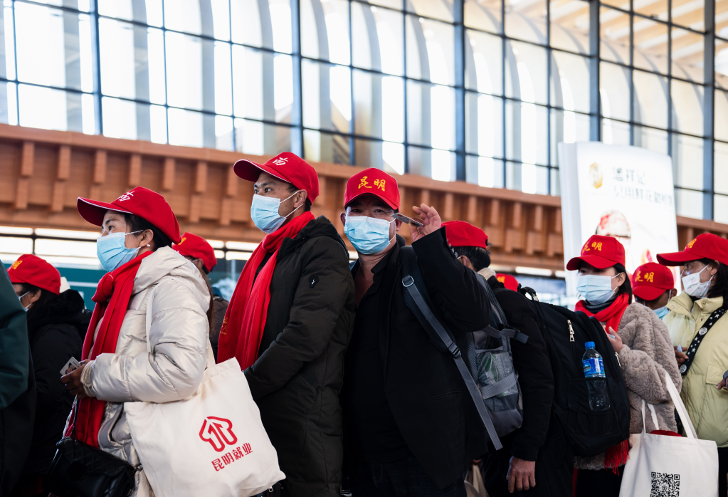 云南“点对点、一站式”有序组织农村劳动力外出务工。连日来,来自全省各地的一批批外出务工人员,分别集体乘坐大巴、火车或飞机,远赴浙江、上海、广东等地就业。