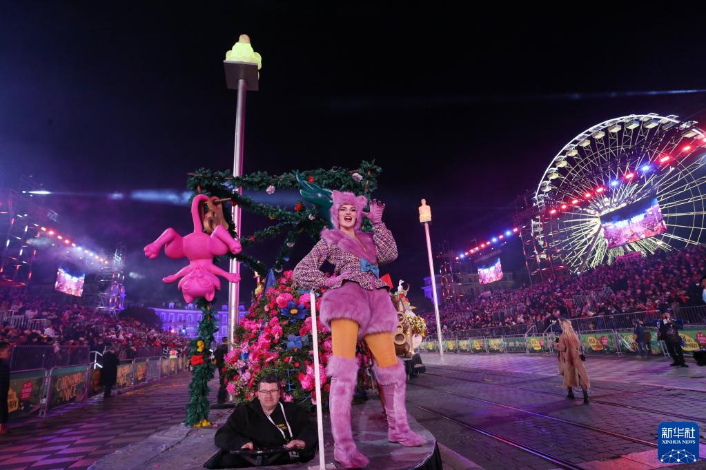 这是2月12日在法国南部城市尼斯拍摄的狂欢节花车夜间游行现场。