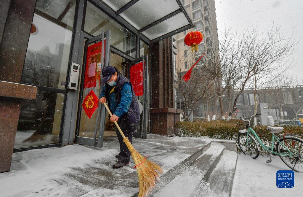 2月13日,在天津市河北区某小区内,物业工作人员为居民楼门台阶扫雪。