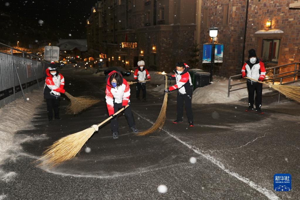 2月13日凌晨,工作人员在北京冬奥会张家口赛区云顶场馆清雪。