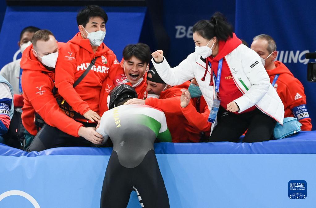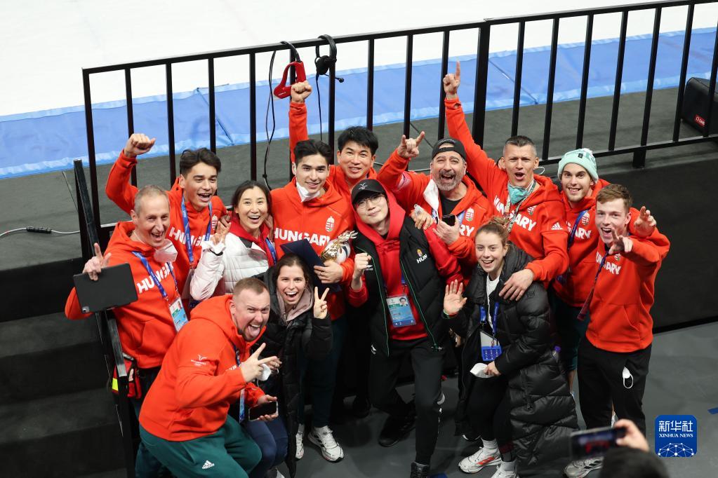 2月13日,匈牙利选手刘少昂(前)在比赛后与团队成员庆祝。