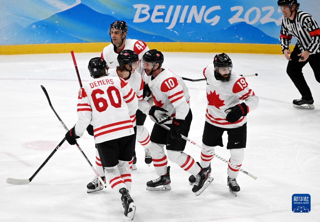 2月13日,加拿大队球员在比赛中庆祝进球。