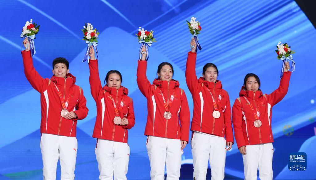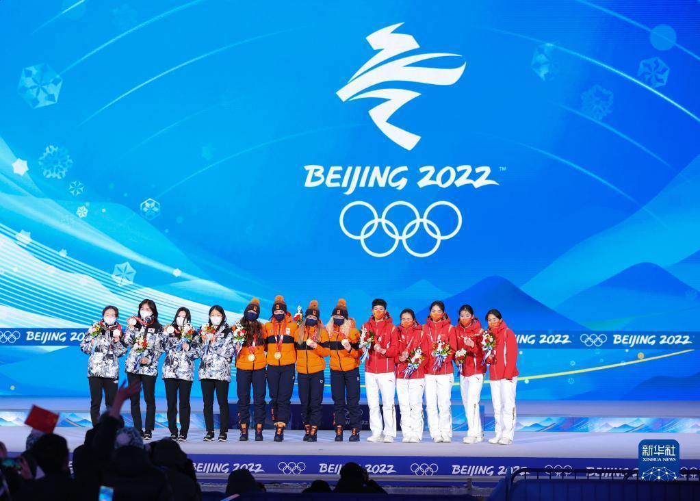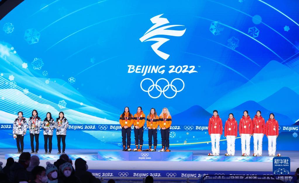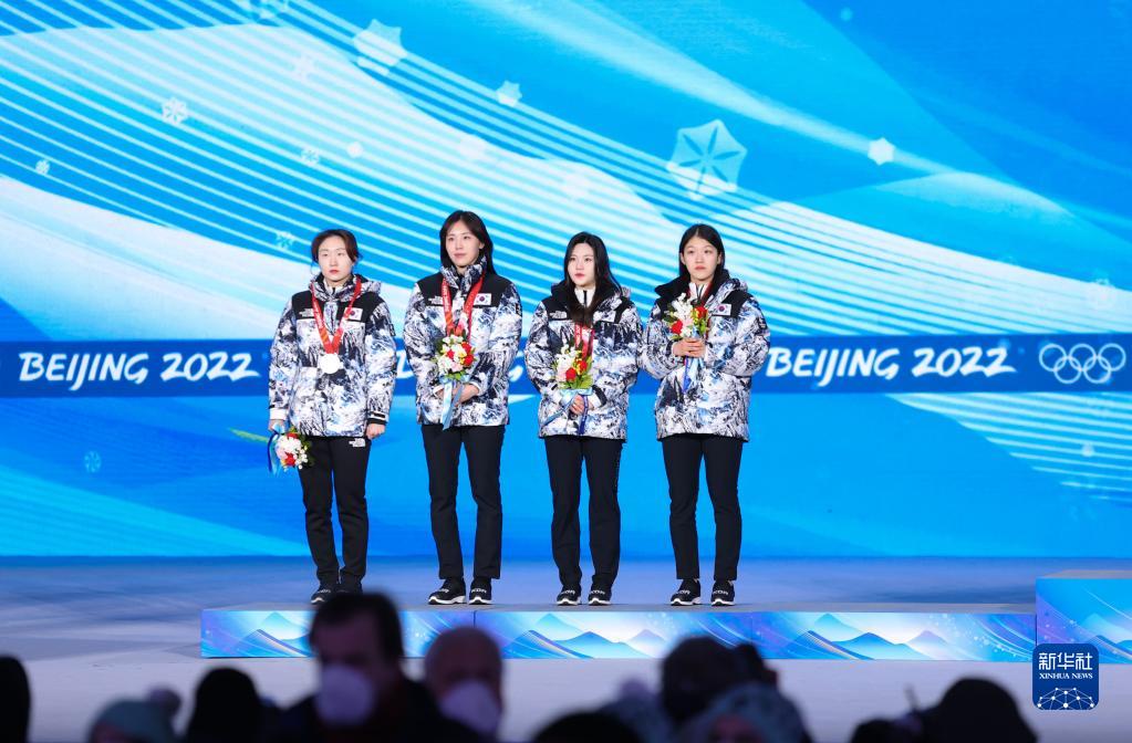 当日,北京2022年冬奥会短道速滑项目女子3000米接力奖牌颁发仪式在北京赛区颁奖广场举行。