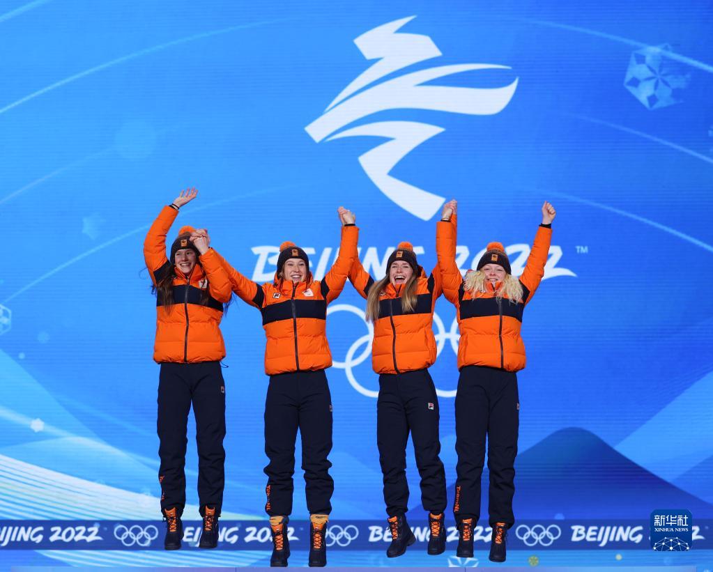 2月14日,冠军荷兰队选手在奖牌颁发仪式上。