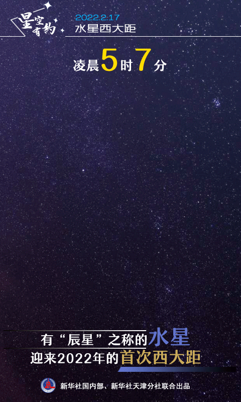 “2022年有些特别,水星共有7次大距,其中,西大距有3次,东大距有4次。2月17日是第一次水星西大距,水星与太阳的距角达到26.3度,是今年的最大距角,水星亮度约为0等。”宋媛媛说。