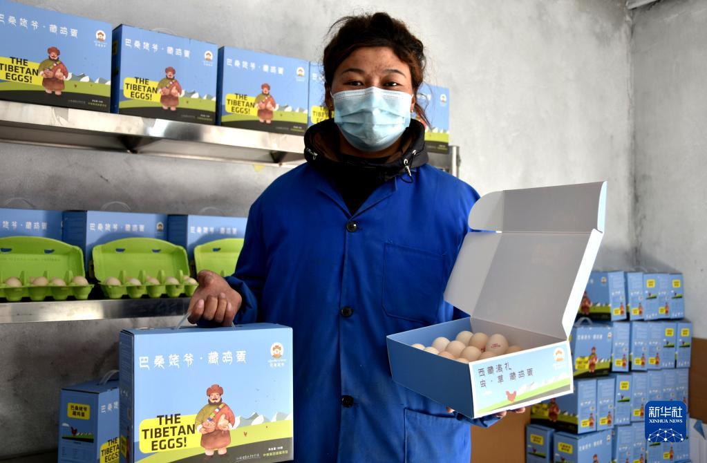 西藏洛扎县次麦藏鸡养殖合作社工作人员在展示特色产品藏鸡蛋(1月19日摄)。新华社记者 陈尚才 摄