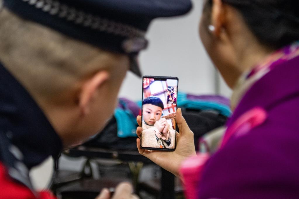 2月15日,祁悦和周幸正在和儿子“豌豆”视频。 新华社记者 唐奕 摄