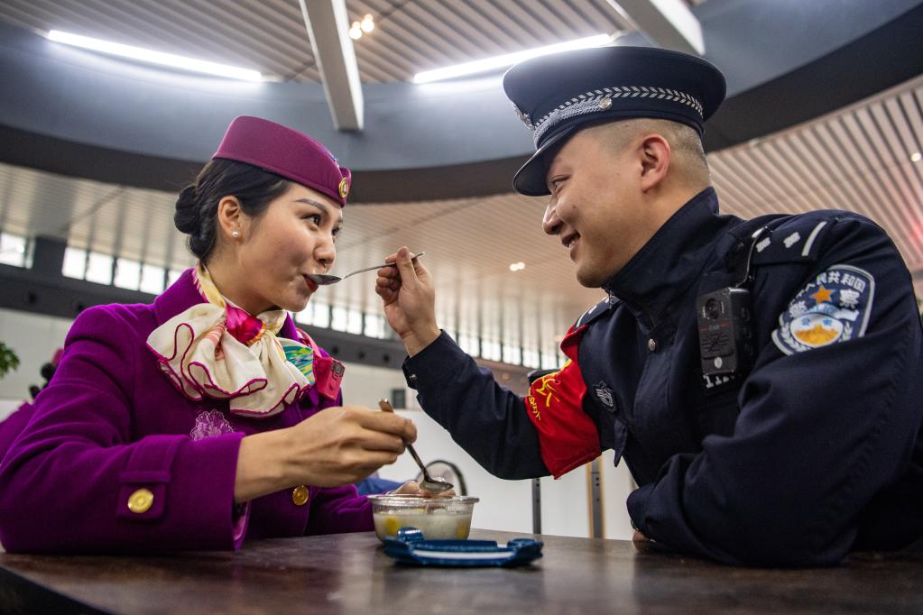 2月15日,祁悦和周幸在待乘室里吃汤圆。新华社记者 唐奕 摄