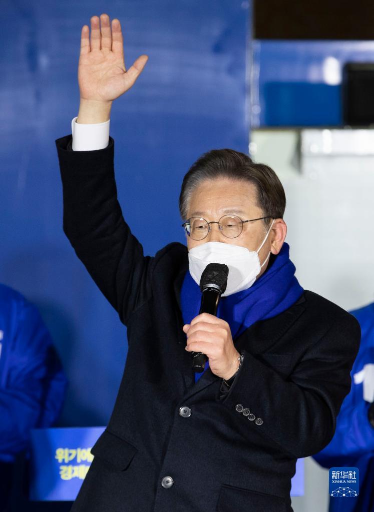 2月15日,候选人李在明在韩国首尔参加竞选活动。