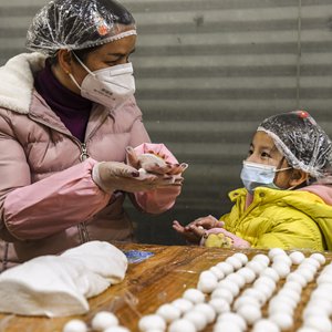 2月14日,广西德保县城关镇莲城社区居民黄荣算(左)与女儿一起制作手工汤圆。新华社记者 曹祎铭 摄