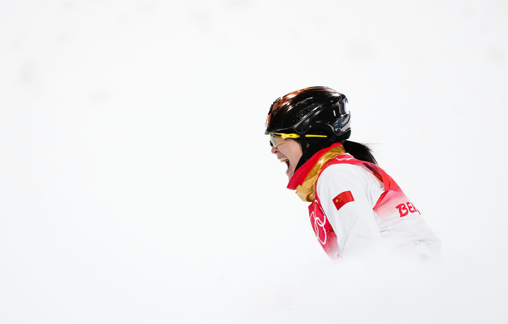 现场沸腾了。零下20多摄氏度的云顶滑雪公园里,呐喊声此起彼伏。31岁的徐梦桃跪在雪地上,用手指比出“第一”的手势,将国旗高高举过头顶,绕着赛场奔跑。