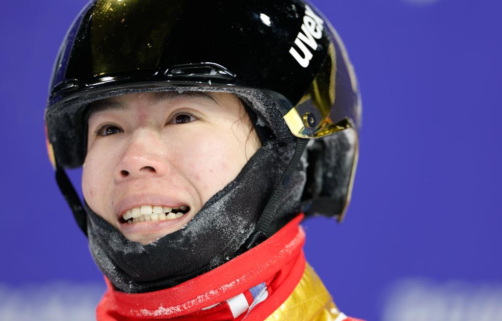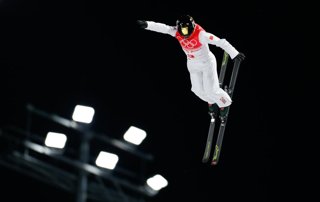 2月14日,中国选手孔凡钰在北京冬奥会自由式滑雪女子空中技巧决赛中。新华社记者费茂华摄
