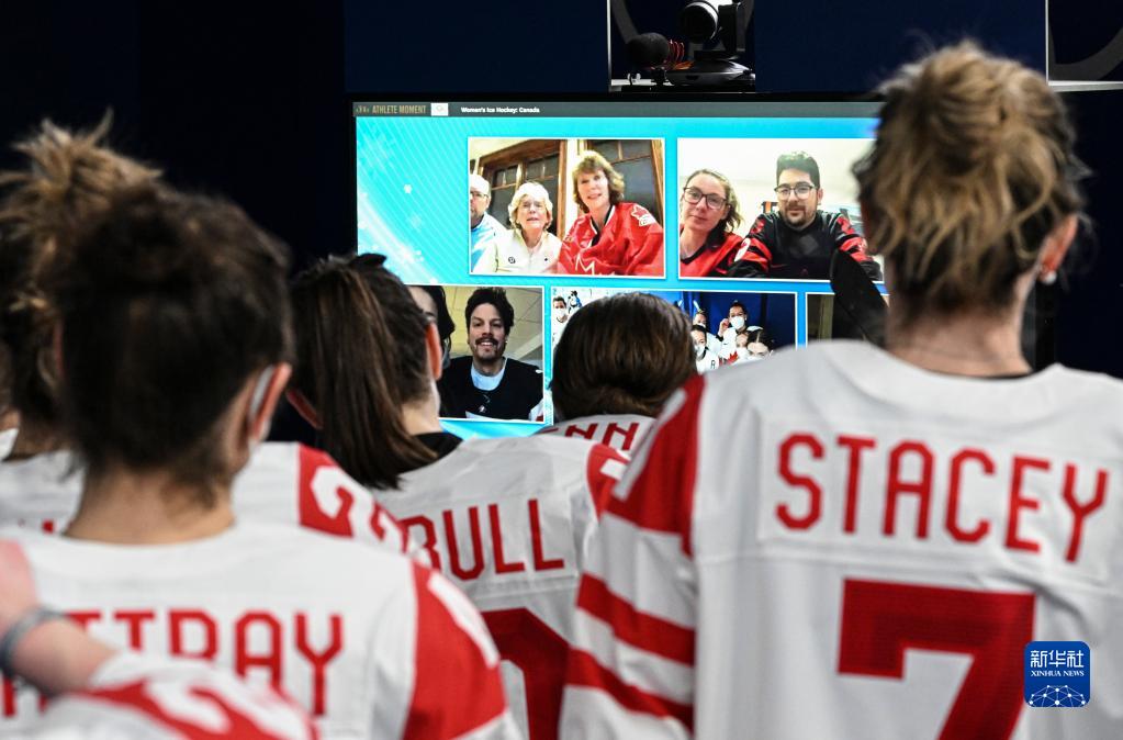 2月14日,加拿大队球员在赛后与亲友团视频连线。