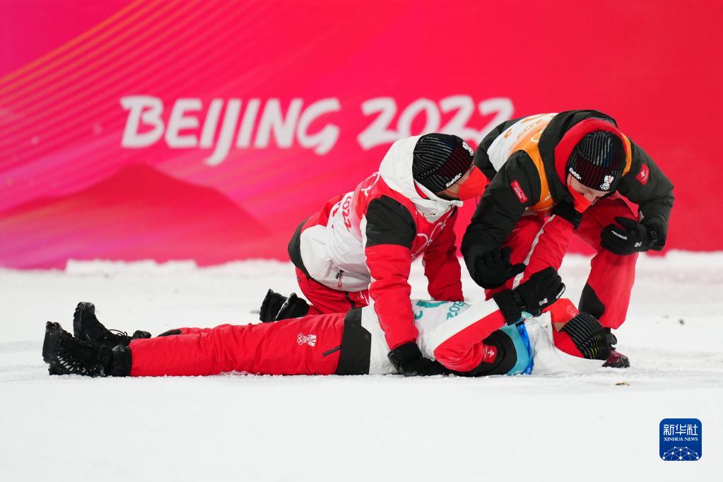2月14日,奥地利队选手赛后倒地庆祝夺冠。