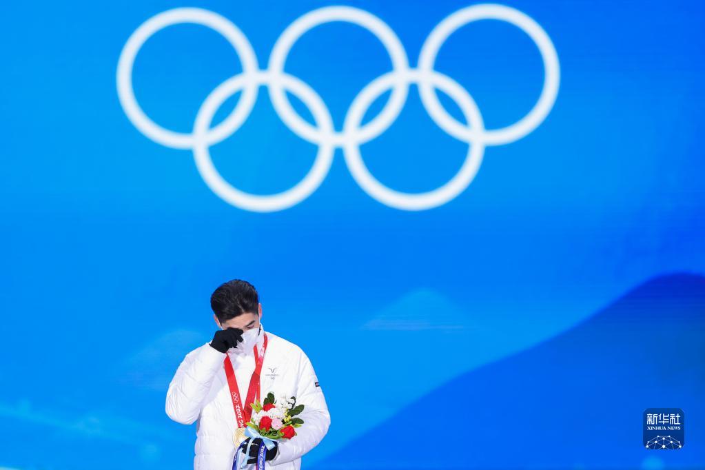 当日,北京2022年冬奥会短道速滑项目男子500米奖牌颁发仪式在北京赛区颁奖广场举行。