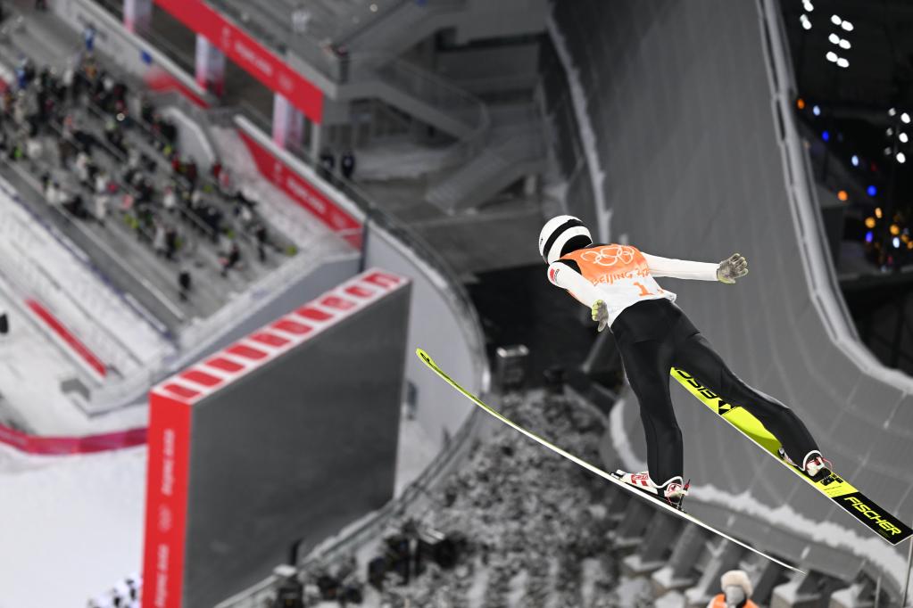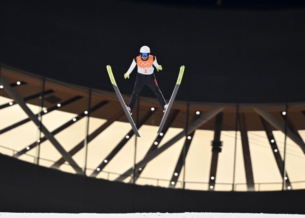 2月14日,中国队选手宋祺武在北京冬奥会跳台滑雪男子团体比赛中。新华社记者冯开华摄
