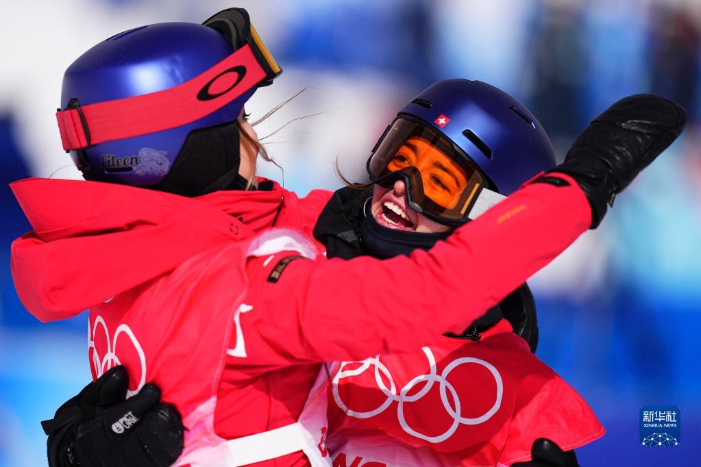2月15日,中国选手谷爱凌(左)和瑞士选手玛蒂尔德·格雷莫德在比赛后拥抱。