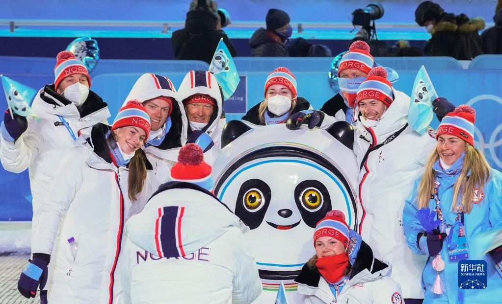 2月14日,观众在颁奖广场与“冰墩墩”合影。新华社记者丁汀摄