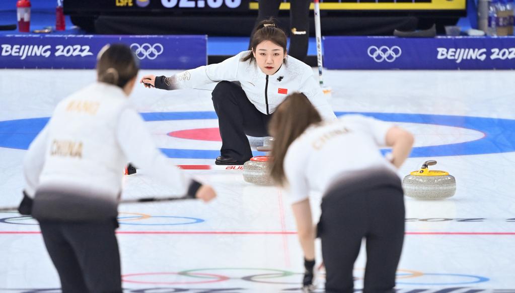 2月13日,中国队选手韩雨(后)在北京冬奥会女子冰壶循环赛中对阵韩国队。新华社记者黄孝邦摄
