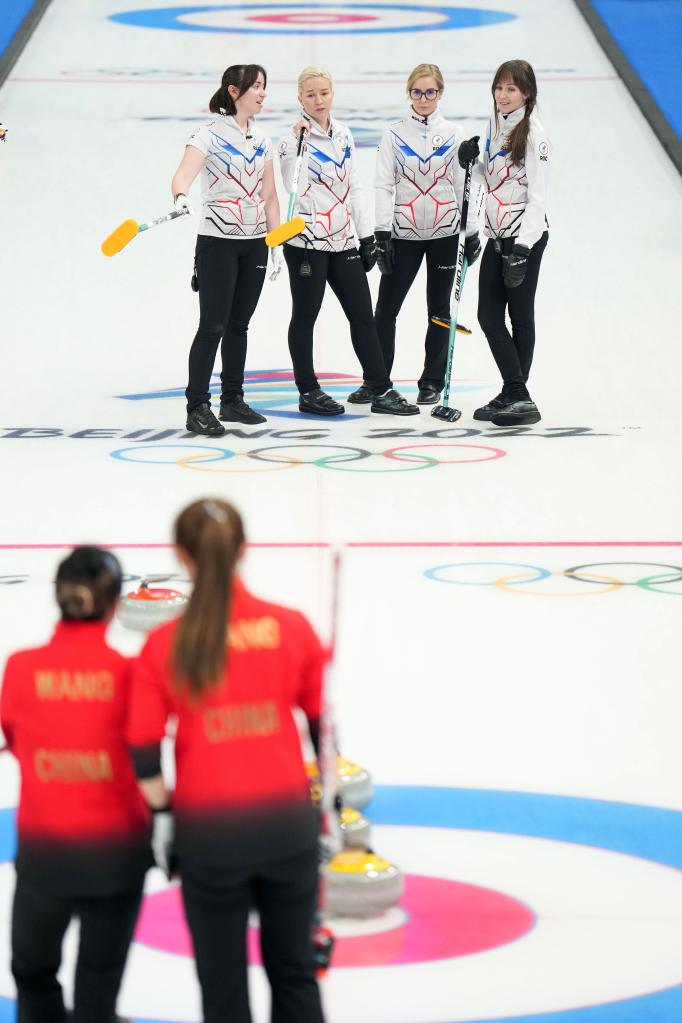 2月15日,俄罗斯奥委会队选手(后)在北京冬奥会女子冰壶循环赛中商讨战术。新华社记者鞠焕宗摄