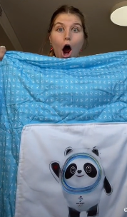 美国运动员展示“冰墩墩”毯子(网络视频截屏)